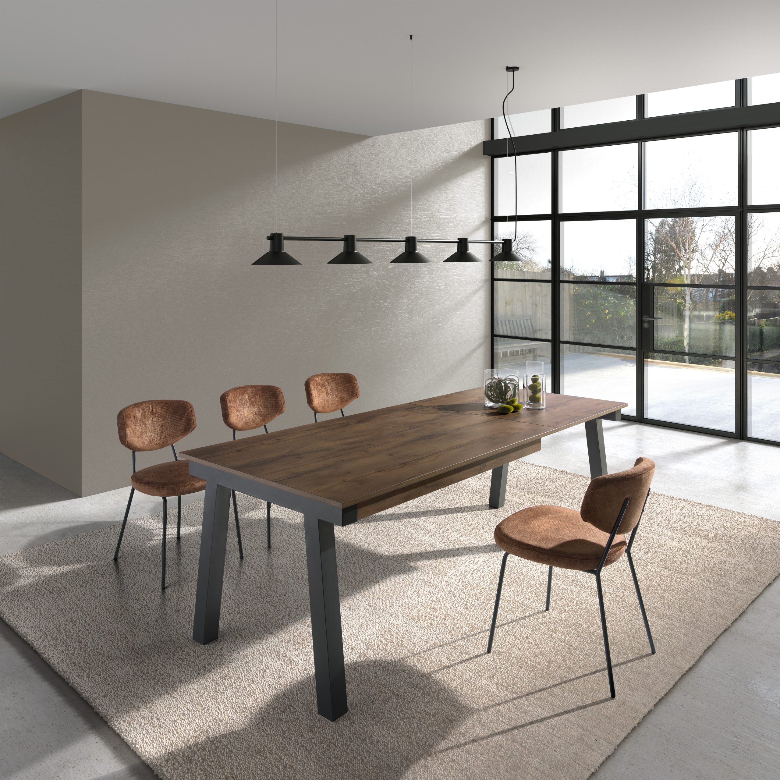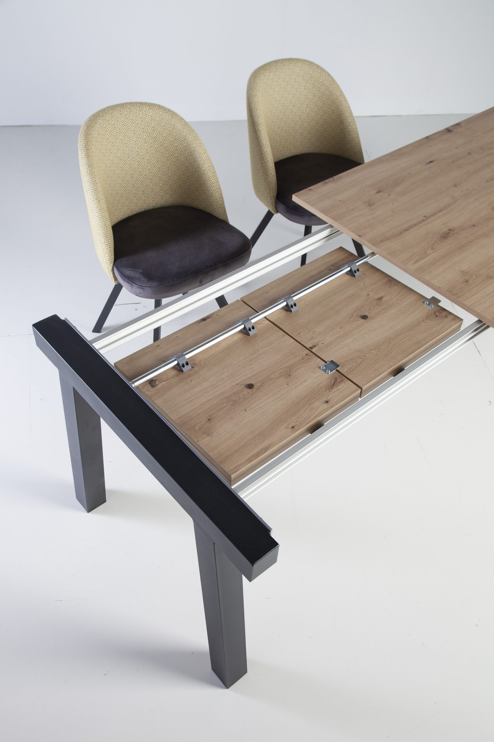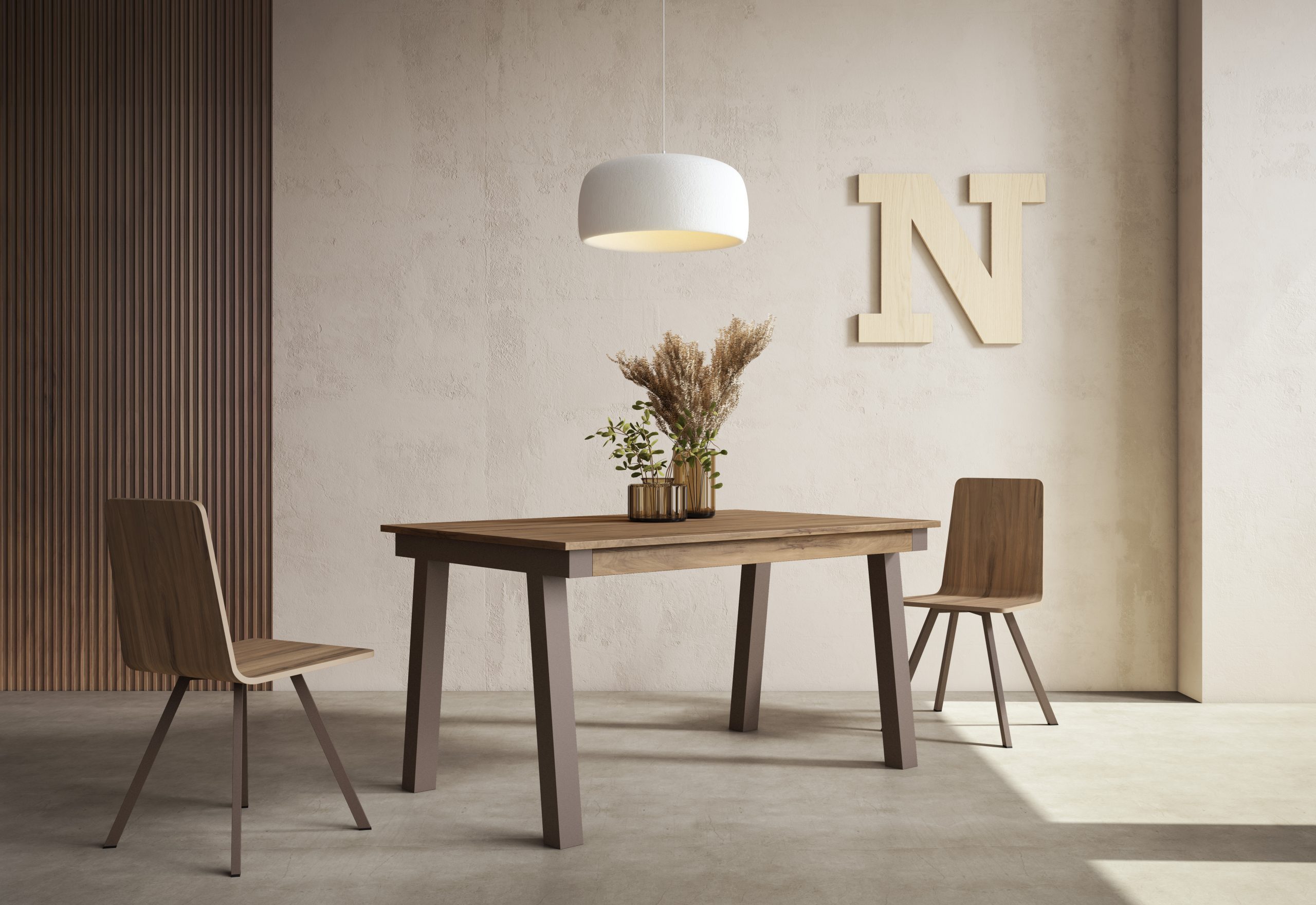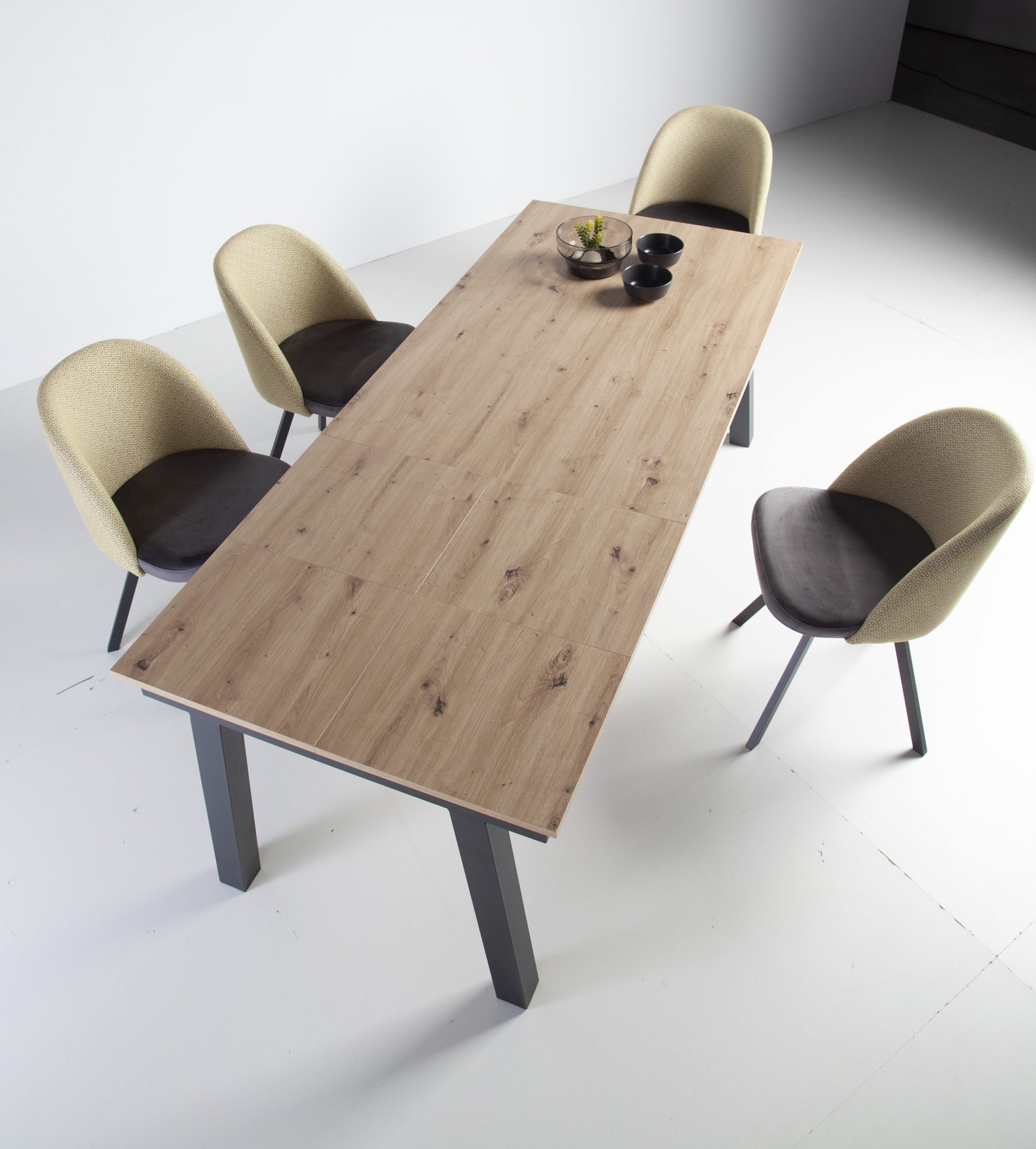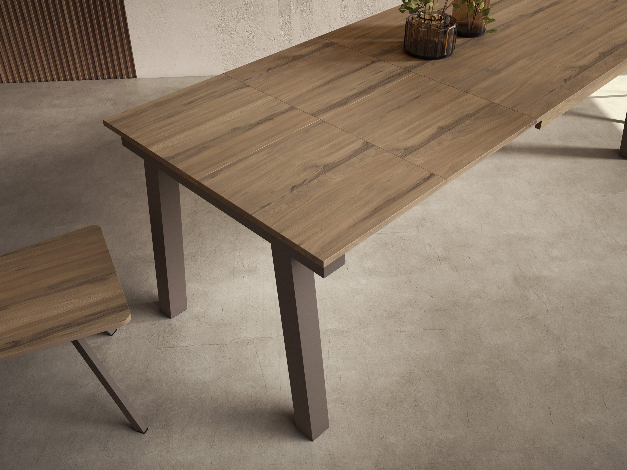 La mesa de comedor extensible rectangular  de apertura lateral, es una solución práctica y elegante para hogares que buscan versatilidad sin renunciar al diseño. Combina patas de metal con imprimación epoxi, que garantizan estabilidad y resistencia, con una tapa de madera técnica laminada (MATEC) de alta durabilidad y fácil mantenimiento.