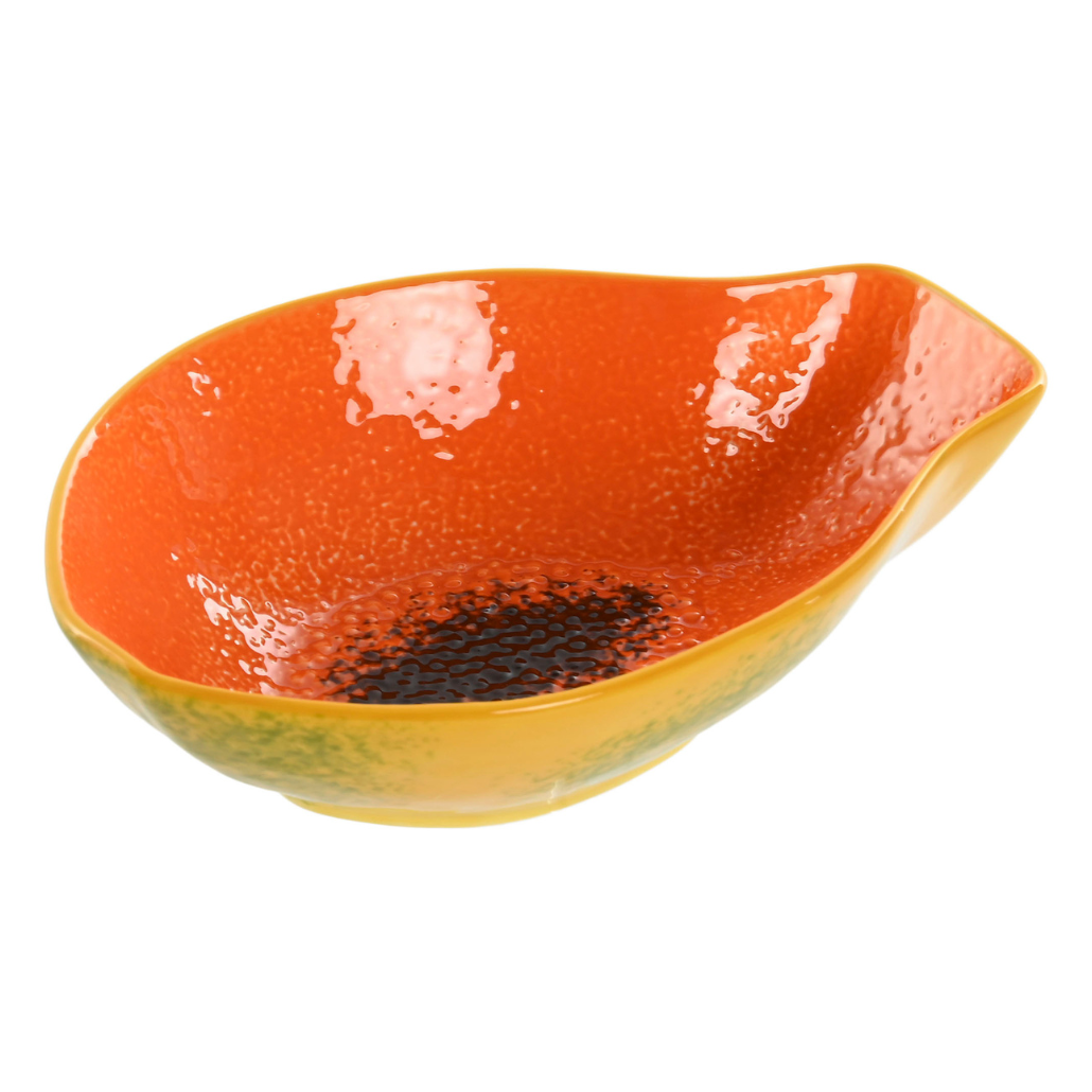 Bol de gres en forma de papaya naranja de 18 × 12,5 × 5,3 cm. Una pieza original y colorida, perfecta para servir aperitivos, frutas, salsas o pequeños postres. Fabricado en gres resistente, aporta un toque tropical y alegre a la mesa, combinando diseño decorativo y uso práctico.