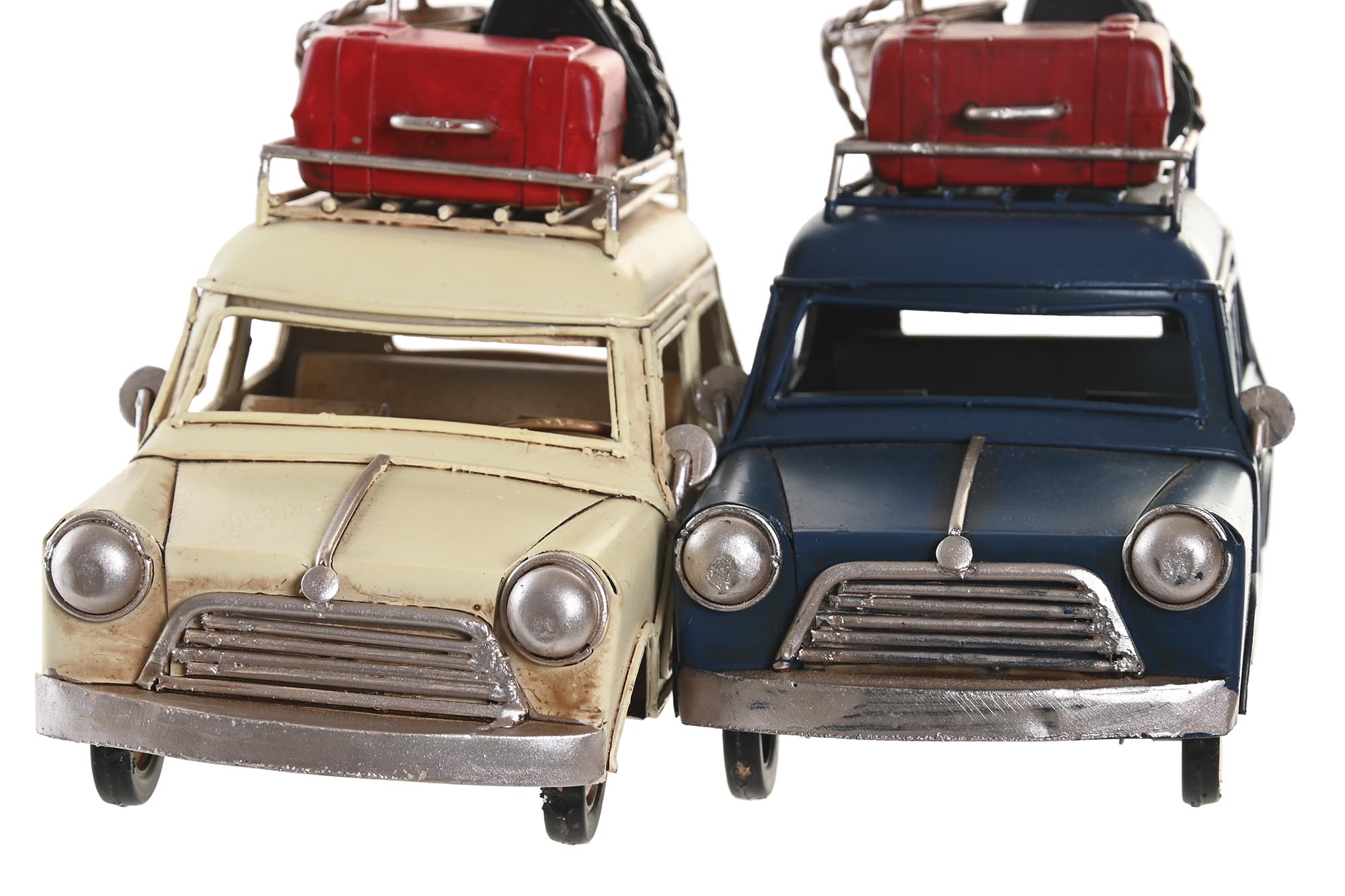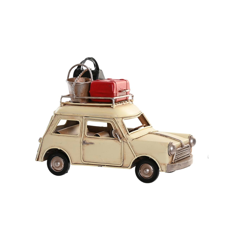 Vehículo decorativo en metal tipo Mini Cooper disponible en azul o beige, con valijas y equipaje en el techo. Una pieza decorativa con aire vintage y estilo viajero, ideal para dar personalidad a cualquier rincón del hogar u oficina. Perfecto para ambientes con decoración retro, industrial o temática de viajes.