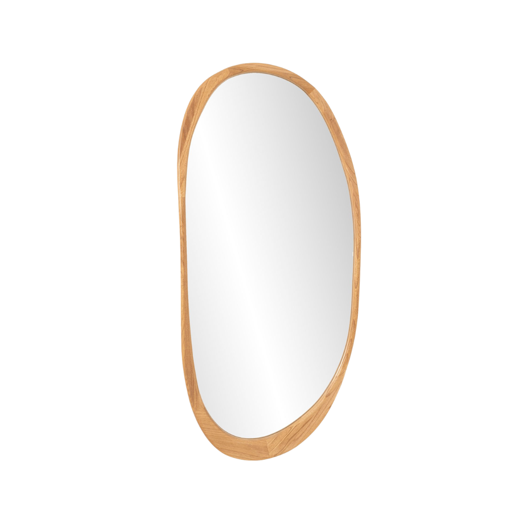 El espejo irregular de madera de roble destaca por su diseño moderno y orgánico. Con medidas de 180 x 75 cm, puede colocarse en vertical u horizontal, aportando estilo y amplitud a cualquier espacio.