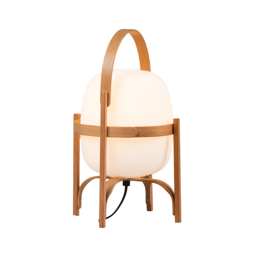 La Cesta, diseñada por el maestro del diseño español Miguel Milá, es un objeto-lámpara atemporal que se integra con la misma naturalidad en una mesa auxiliar que directamente en el suelo. Su estructura de madera de cerezo, ligera y resistente, envuelve y protege el globo de vidrio opal blanco, que difunde la luz de forma suave y envolvente.