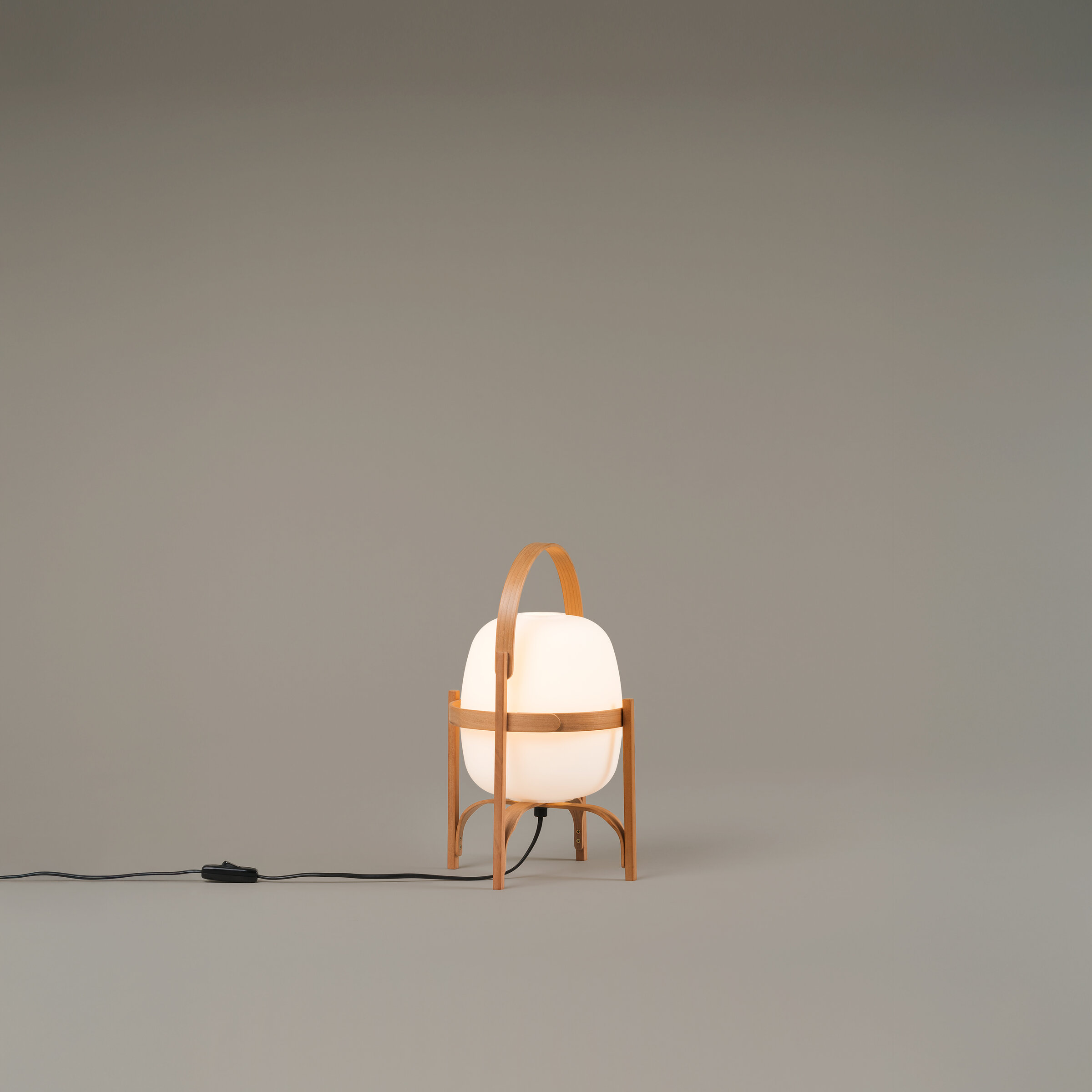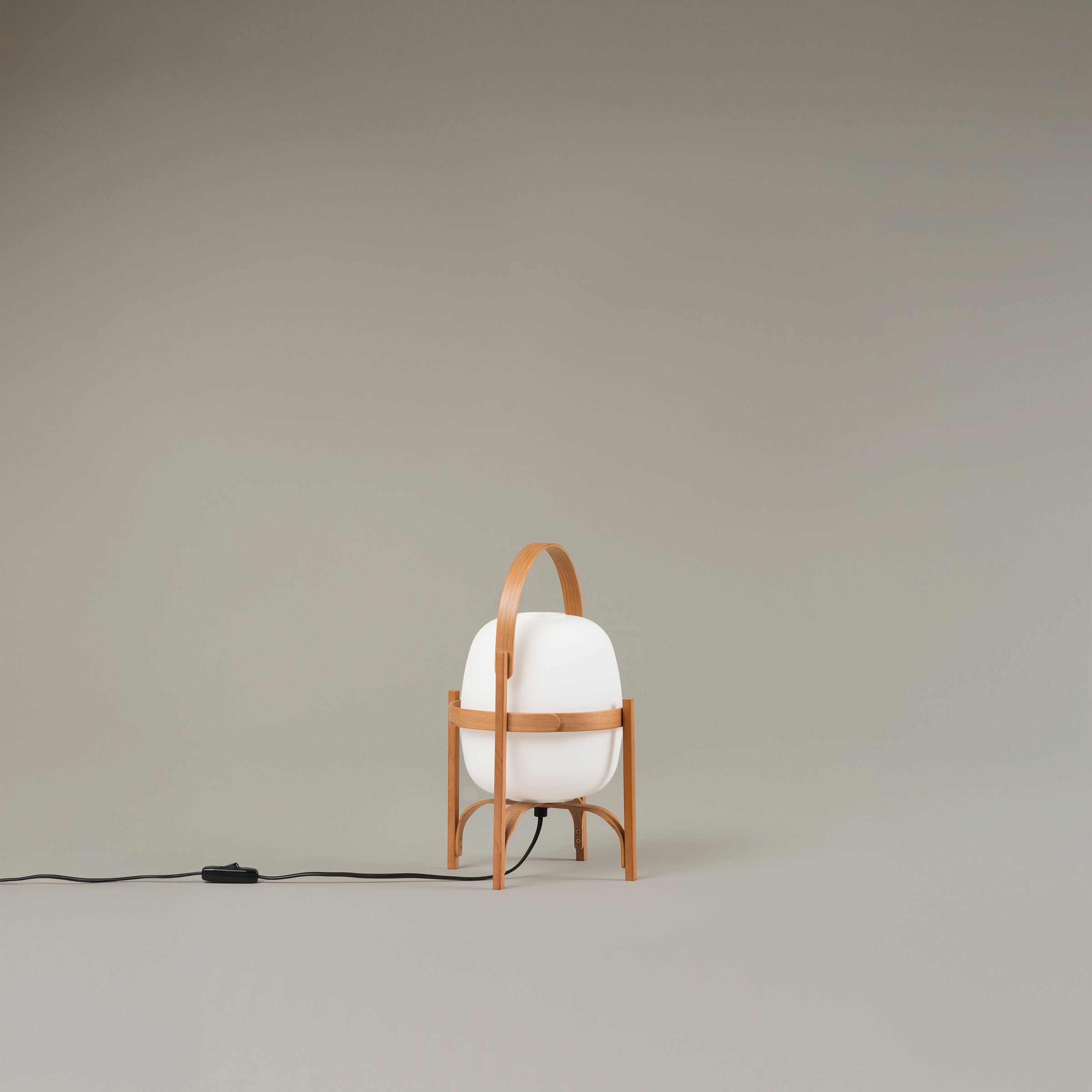Su cuerpo está elaborado en madera de cerezo pulida y ensamblada con precisión, aportando calidez y carácter artesanal. La pantalla puede elegirse en vidrio opal blanco, que ofrece una luz más envolvente y delicada, o en polietileno blanco opal, una alternativa ligera y resistente pensada para espacios con uso diario o presencia infantil.
