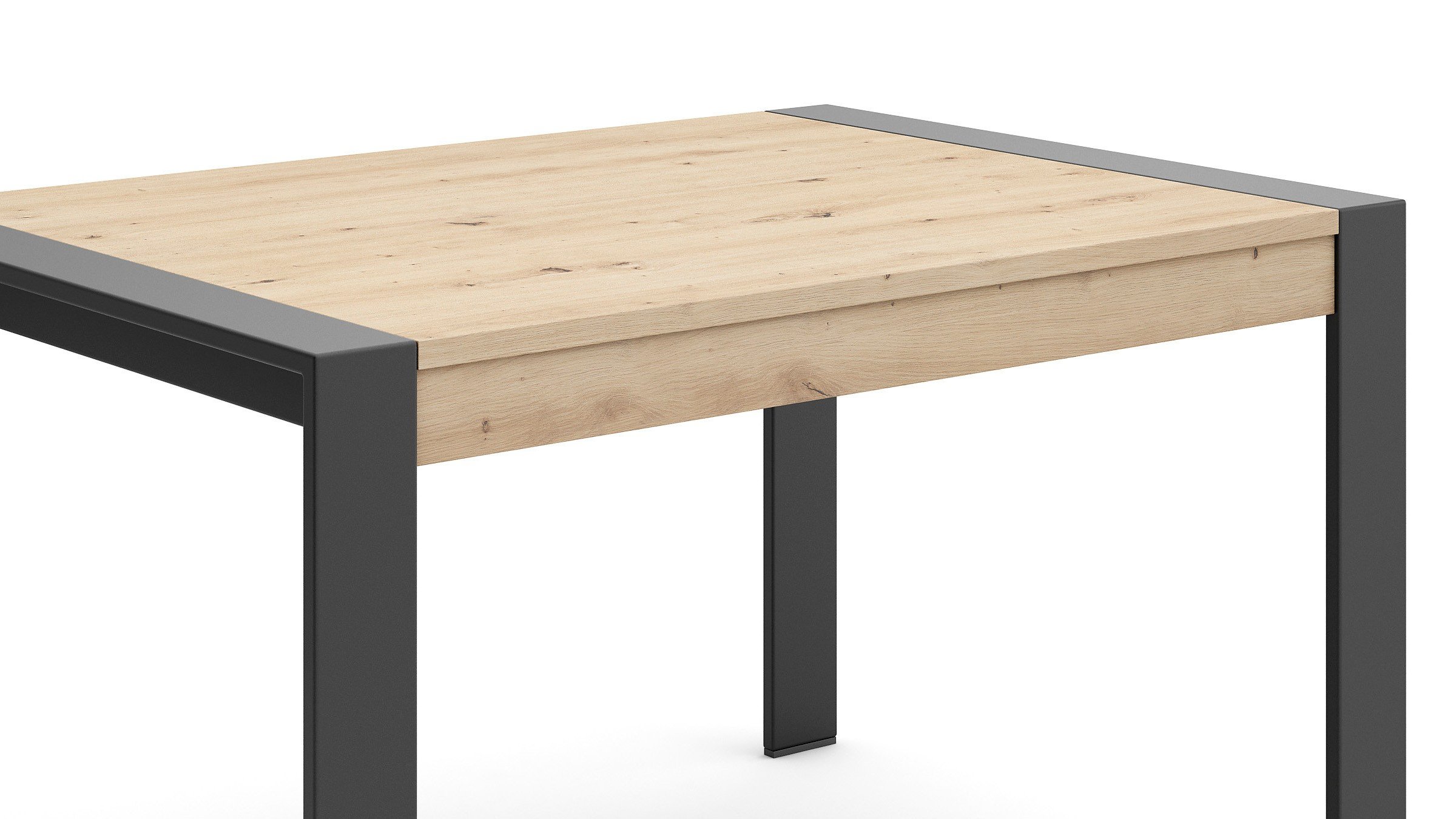 Mesa de comedor extensible rectangular con patas de metal y tapa de madera técnica laminada. Diseño resistente y funcional, ideal para adaptarse a cualquier espacio.