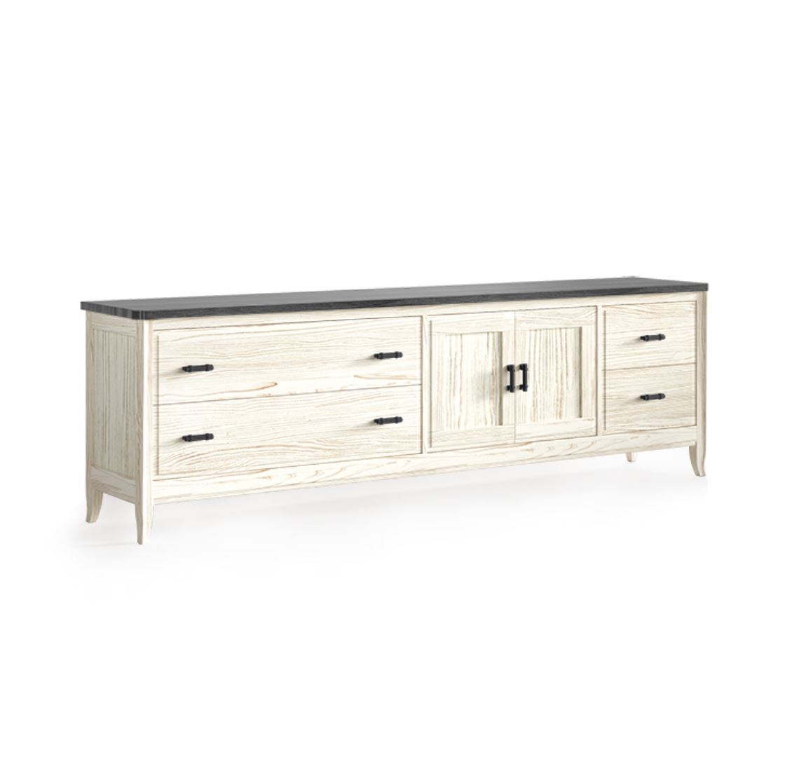 Esta Mesa TV con gran capacidad de guardado, con dos puertas abatibles y cuatro cajones, es una pieza de mobiliario diseñada para realzar cualquier espacio con un estilo clásico y sofisticado. Fabricada con madera de pino macizo seleccionado, ofrece resistencia, durabilidad y un acabado de alta calidad que se integra fácilmente en salones, comedores o despachos.