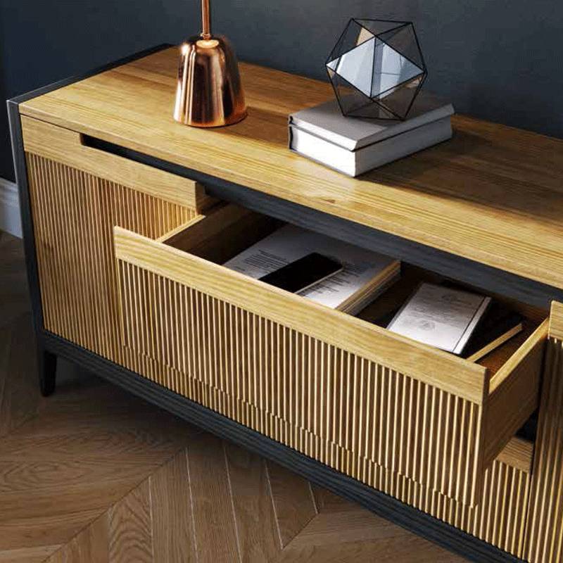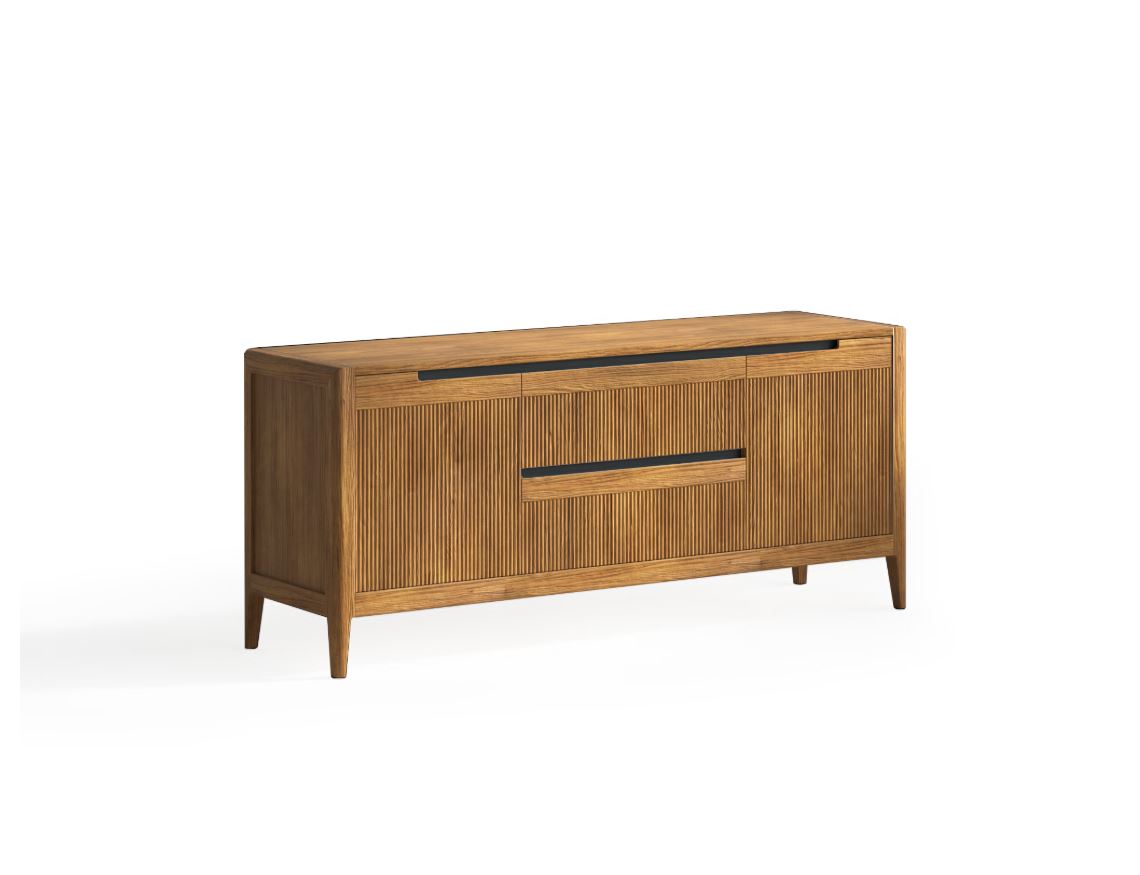 Sus puertas acanaladas crean un juego de sombras y relieve que aporta personalidad y luminosidad a la pieza, mientras sus compartimentos internos permiten organizar dispositivos multimedia, cables, accesorios o decoración de forma cómoda y discreta.
