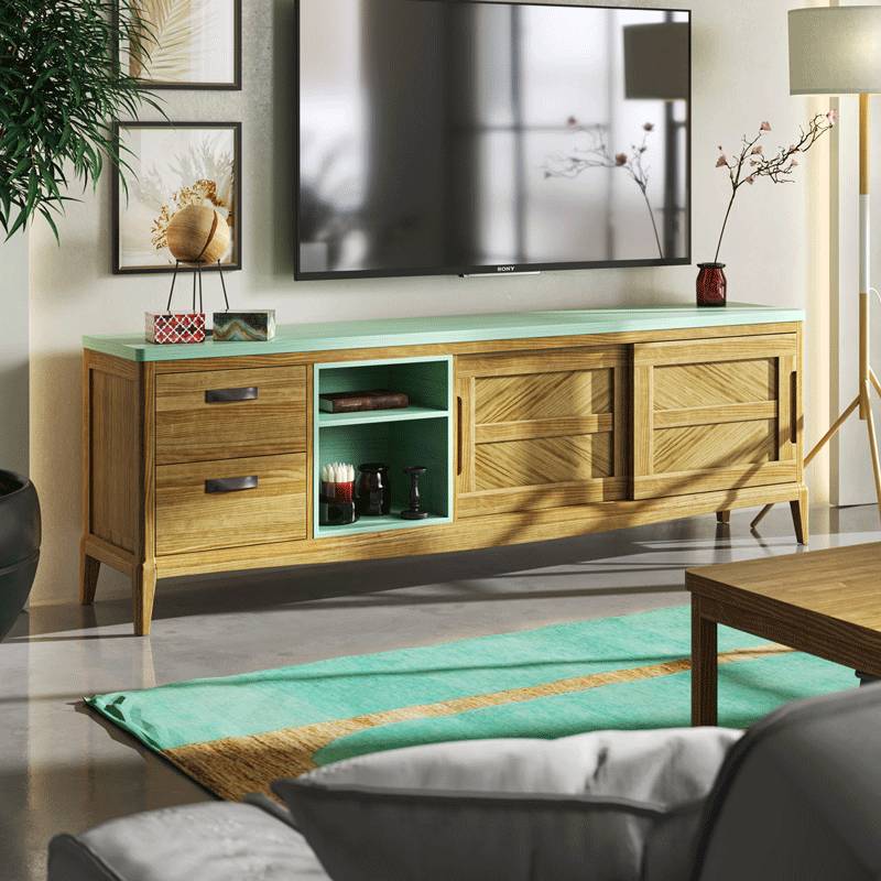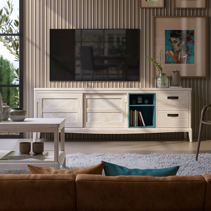 El mueble TV Quebec combina funcionalidad y estilo en una sola pieza. Fabricado en pino macizo, destaca por su robustez, calidez y resistencia, aportando un aire natural a cualquier estancia. Su diseño equilibrado encaja tanto en decoraciones modernas como en ambientes más clásicos.