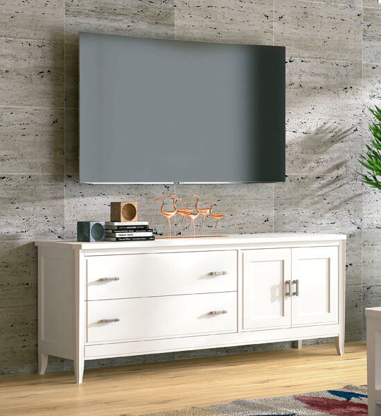 Esta Mesa TV con gran capacidad de guardado, con dos puertas abatibles y dos cajones, es una pieza de mobiliario diseñada para realzar cualquier espacio con un estilo clásico y sofisticado. Fabricada con madera de pino macizo seleccionado, ofrece resistencia, durabilidad y un acabado de alta calidad que se integra fácilmente en salones, comedores o despachos.