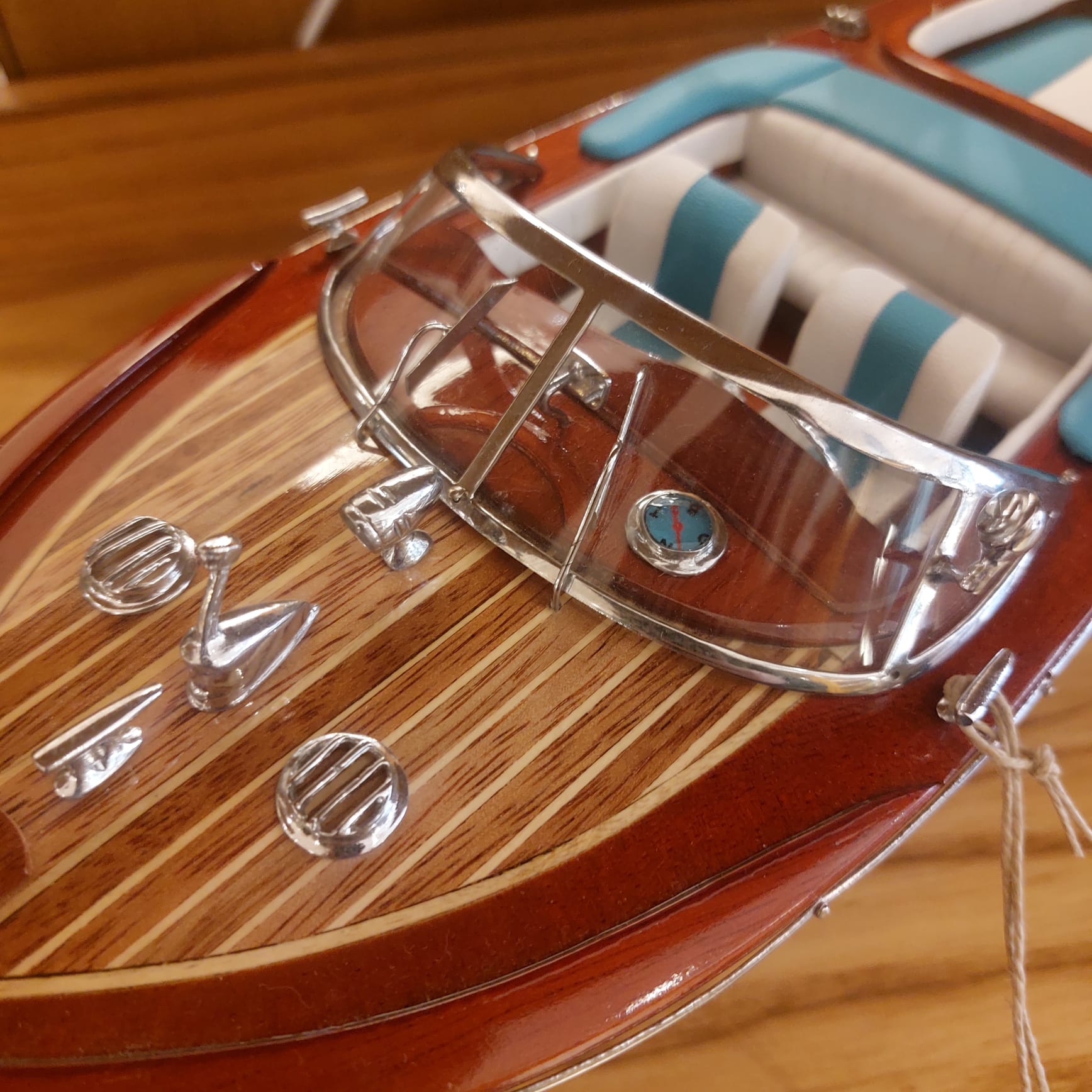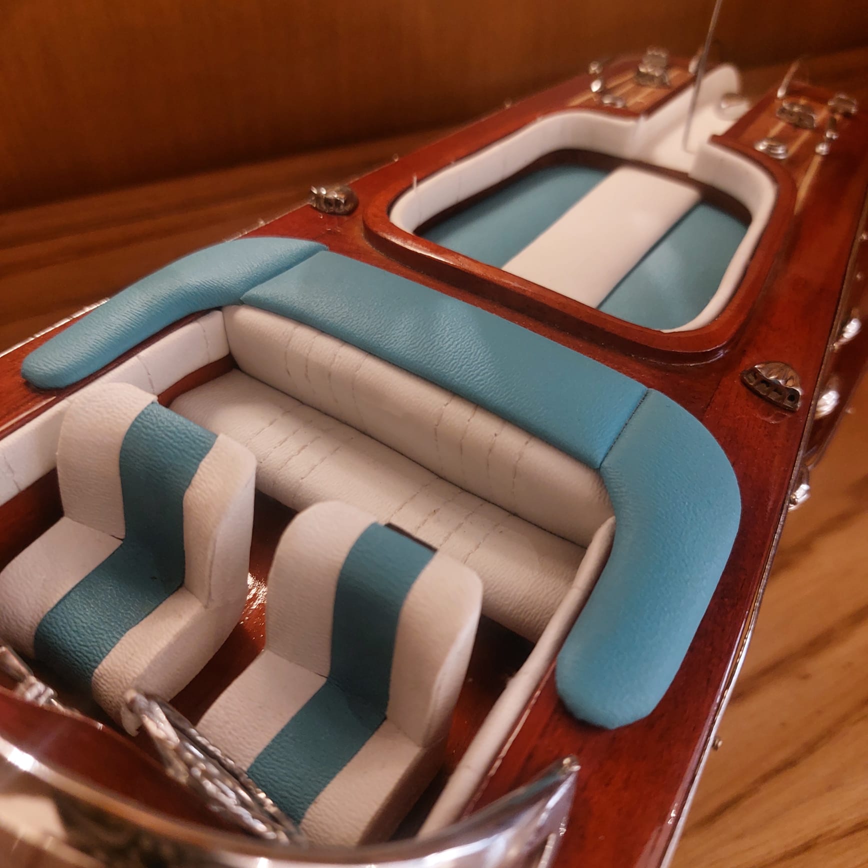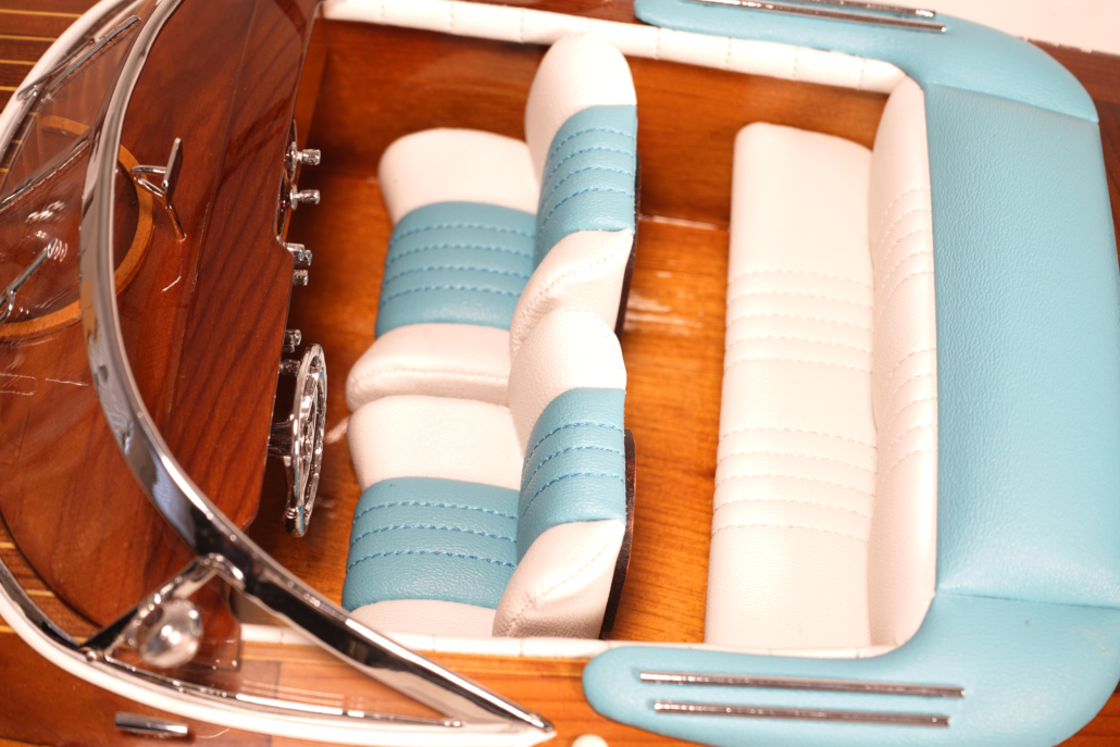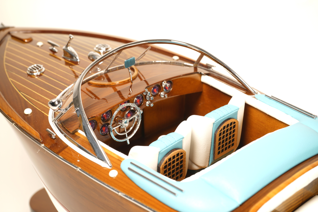 La maqueta Runabout Aquarama captura la esencia del lujo y la sofisticación de los años 50, evocando la vida de la jet set en la Costa Azul, Lago di Como y Cannes. Fiel a los originales, este modelo reproduce cada detalle: el casco y la cubierta de madera, y el interior de cuero auténtico, reflejando la elegancia y el estilo de estas emblemáticas lanchas motoras.