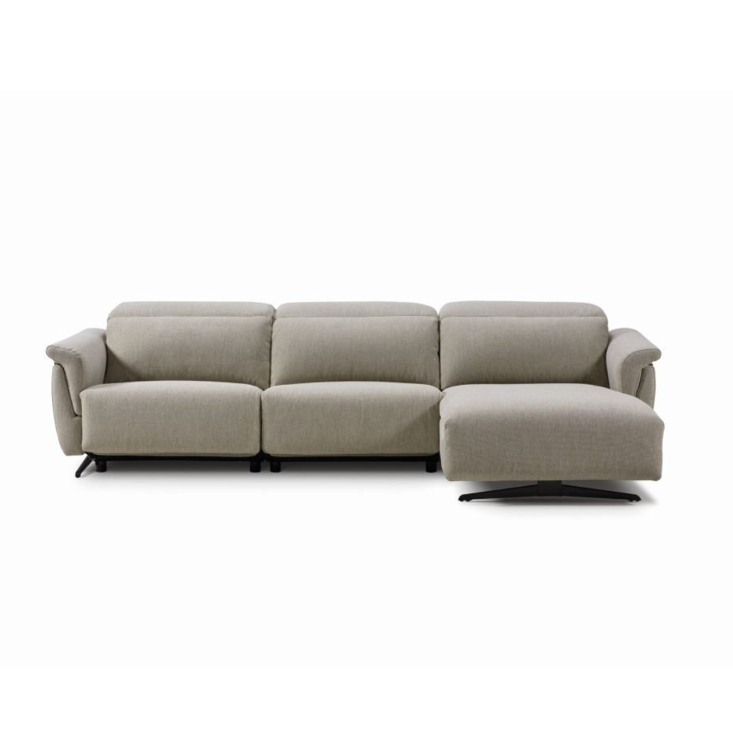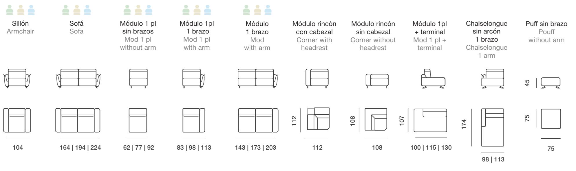 El sofá se apoya sobre patas metálicas de color gris oscuro de 13 cm, aportando estabilidad y un toque moderno. El brazo tiene una medida fija de 21 cm, sin posibilidad de reducción tanto en módulos como en chaiselongue. Para mantener una estética uniforme a lo largo del tiempo, no se recomienda combinar diferentes mecanismos (relax, fijo y deslizante) dentro de un mismo lineal.