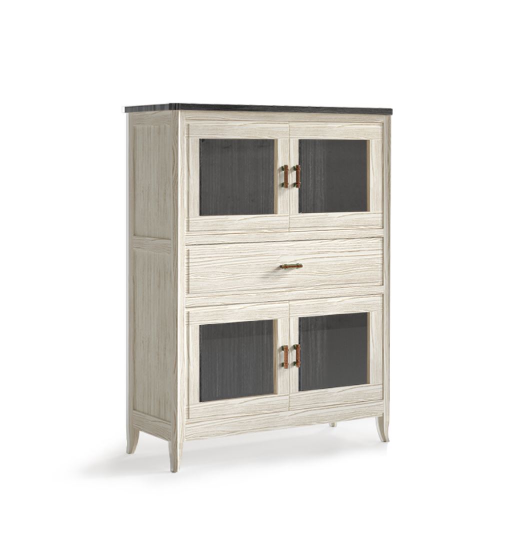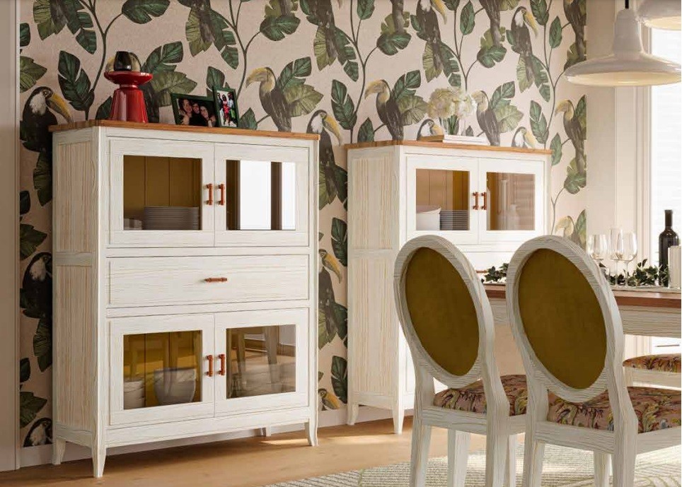 El Vajillero con cuatro puertas abatibles de cristal + 1 cajón en el centro es una pieza de mobiliario diseñada para realzar cualquier espacio con un estilo clásico y sofisticado. Fabricada con madera de pino macizo seleccionado, ofrece resistencia, durabilidad y un acabado de alta calidad que se integra fácilmente en salones, comedores o despachos.